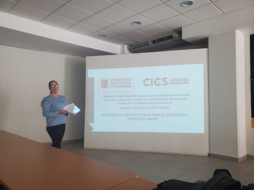 Judith Escandón Juárez, también estudiante de la Maestría en Ciencias Sociales para el Desarrollo Interdisciplinario de la FCPyS UAdeC UT, presentó su tema de investigación sobre «La Implementación de la Nueva Escuela Mexicana y su Relación con la Organización Escolar Comunitaria en el Nivel Básico de Educación Primaria en el Contexto Post-Covid». Su estudio se centra en comprender la relación entre la Escuela Nuevo México y la organización escolar comunitaria en el contexto de la era post-Covid, a través de un estudio de caso de dos escuelas primarias de la Comarca Lagunera.